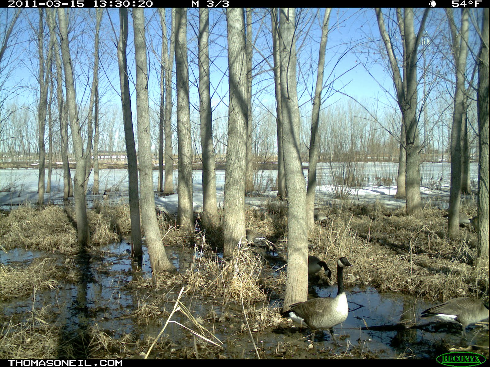 What it turned out to be was a whole bunch of shots of Canada geese roaming through the semi-flooded area, and a few ghostly nighttime shots of the raccoons. I've proven what I wanted to prove, that the camera works pretty well, and I'll deploy it in the Black Hills ASAP. Unfortunately that probably won't be until July. Once again, you'll have to use your imagination and pretend that these geese are elk or mountain lions. Click on the image for a larger version.