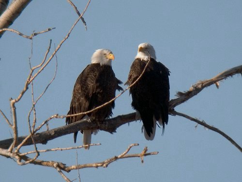 Most of the eagles are transients, but there are some residents. Just based on what I've seen on this trip, I think the two adults and several juveniles which hang around the nests in the northwest part of the refuge are the full-time residents. Even though this isn't the season the nests are used, the birds are lurking around them and occasionally roosting on them. I don't think eagle pairs necessarily stay with each other year-round, but these two seem to. The active nest is in the same tree.
