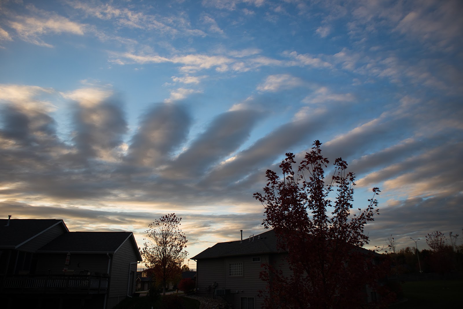 I'm not an early adopter any more, but I did acquire a Canon M100 mirrorless camera today, one day after the official US introduction. It is a cloudy, windy day today, but I went down the local duck pond a few minutes ago to see what it can do. I also bought a converter so I can use my full-sized EOS lenses on it, so my combo for today was the M100 and the venerable 70-200 f4. I know the lens is sharp due to an image I got in the Galapagos many years ago, but it lacks image stabilization so I need to keep a close eye on shutter speed. I manually set shutter speed for 1/500, which resulted in a wide-open f4 and narrow depth of field. The birds closest to the camera are fuzzy, which you can see if you click on the image to bring up the larger version. With that proviso in mind, I see the M100/70-200 combo standing in for the 5D Mark III/100-400mm when I feel like traveling light. And when I am in full 5D Mark III/500mm monster lens mode, I'll have the M100 with its 15-45mm kit lens to cover the shorter end, which is a few steps up from the 7-year-old S95 point-and-shoot that has been filling that role. I've been shooting RAW instead of JPG 99.9% of the time since my first digital SLR in 2002. One pain-in-the-ass problem which I also endured with the 5D is my version of Photoshop Elements can't process the M100's RAW files. Eventually I upgraded from version 9 to version 14 so I could process 5D RAW files. Until I get tired of the extra steps involved and spend the $99 to upgrade Elements, I'll have to convert the RAW files to DNG files using Adobe DNG converter. After I got back I saw this weird cloud formation like piano keys in the sky and and got this shot with the 15-45mm kit lens. |