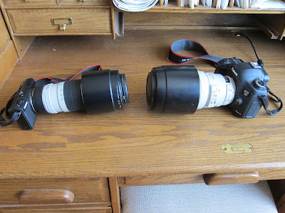This image, which is not included in the slide show, shows the M100 with 70-200 on the left and the 5D with 100-400 on the right. The difference in length isn't much (9.5 inches vs. 10.5 inches, not including the lens hoods), but the M100 rig weighs only about half as much, 45 ounces vs. 88 ounces. So when I don't want to take all the heavy stuff, the M100 is a viable option. Dec. 9 update: And when I do carry the heavy stuff, I can hook the M100 to the 500mm lens (supposed 800mm equivalent) on a tripod to focus in on an eagle's next while keeping the 100-400 on the 5D to get in-flight shots. Click on the image to see larger version.