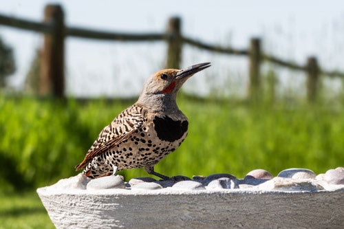 My closeup trail camera showed at least one Northern Flicker making multiple visits to the small bird bath yesterday, so today I set up the motion trigger with the 5D and 70-200 set at 100mm. For some reason there were 500 false triggers, but I got what I was going for.