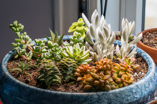 ![]() One of my first attempts at making a succulent bowl. Clockwise from right, the white Senecio haworthii Cocoon Plant, Sedum Shooting Stars, Crassula String of Buttons (variegated), a random rosemary, Oscularia deltoides (one of several unrelated varieties commonly known as Ice Plant), a pup from the Haworthia limifolia Fairy Washboard, a Cuban Oregano which has since been relocated, and at center one rosette from the pot of four Echeveria Lilac Mist. (2026-03-12) |